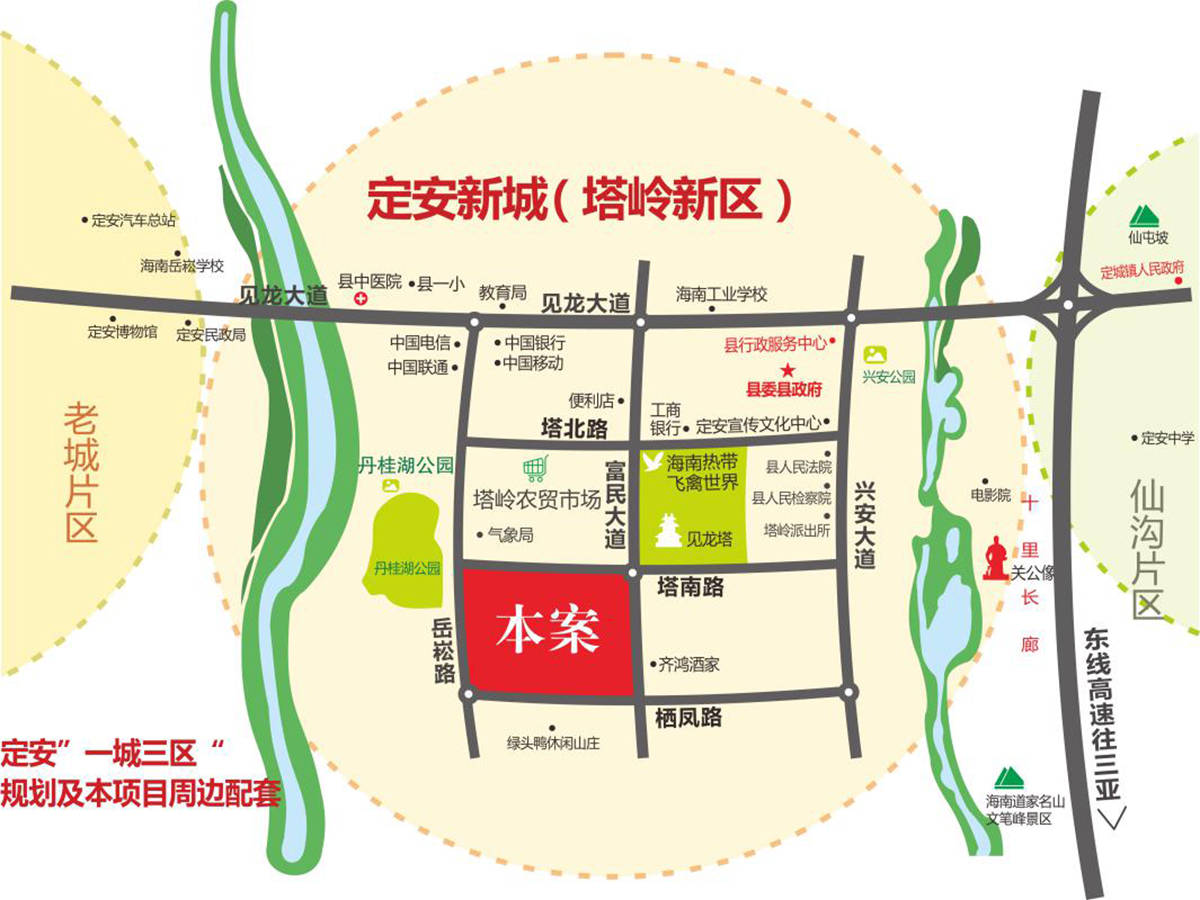 椰风水漾人家坐落于定安塔岭新区南部的岳崧路和塔南路交汇处,水漾人家总用地面积94455㎡(141.68亩),总建筑面积约20多万平方米,绿化率达42.6%,水漾人家规划定位为休闲养生度假大型公园式社区。水漾人家的东侧是百鸟园-飞禽世界,西北侧是规划建设中丹桂湖公园,水漾人家距离高速公路约1000多米。