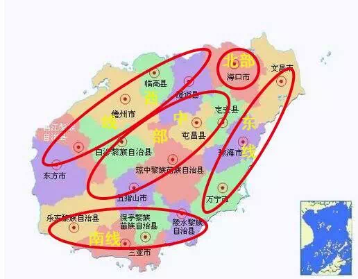 根据地理位置,为了让大家更为直观的了解海南,我们把海南划分为南线:三亚、陵水、乐东、保亭;东线:文昌、琼海、万宁;西线:东方、昌江、儋州、临高、澄迈;北部:海口;中部:定安、屯昌、五指山、琼中、白沙。(如下图)