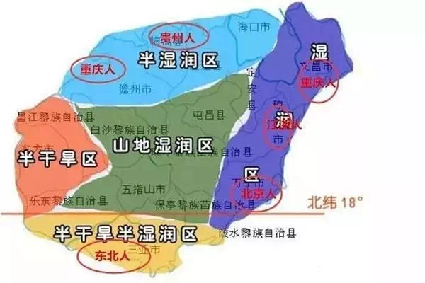 值得关注的是,有人后面根据以上区域的划分,以及北方人喜干,南方人喜湿的特点,结合实际购房情况,绘出了岛外人群在海南的居住分布图(上图):