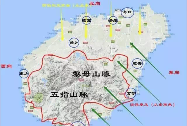 整个海南岛的地形是中高周低,小岛中部有高耸的五指山和黎母山两大山脉,结合季风运动看,就造成了中部山地和东部沿海地区形成迎风坡,年降雨量就多,而以西部沿海形成的背风面雨量自然少,而南北就夹在中间;结合北部南下冷空气看,中部两大山脉也起到关键的作用,两大山脉对南下的冷空气形成了一定的阻挡作用,进而又影响到海南的气候。