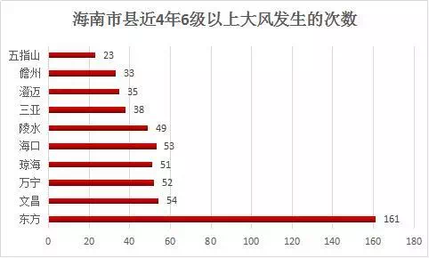 从图上可以看出来,西线的东方是全岛大风发生最多的城市,文昌、万宁、琼海、海口、陵水差不多,风力最小的是中部的五指山。如果单看大风天气的话,东方是受影响较大的市县。