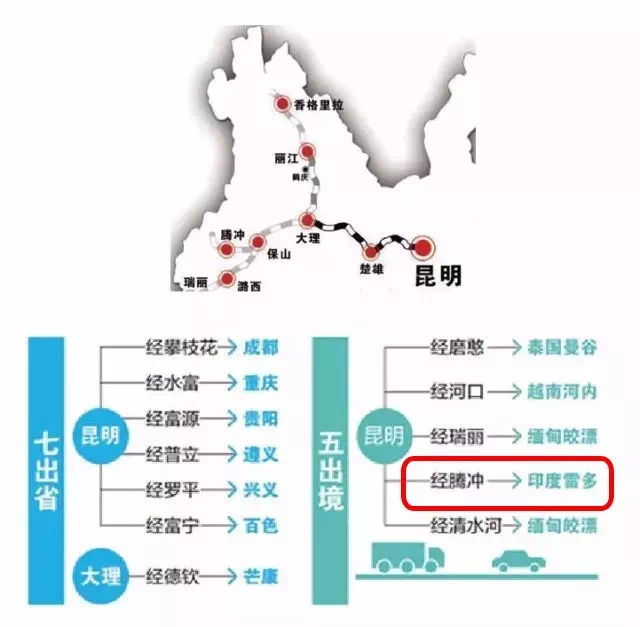 杭瑞高速公路一路向西连接昆明、楚雄、大理、腾冲,腾冲两条二级国际公路通往缅甸,由昆明出发经腾冲至缅甸到印度雷多的中缅印国际大通道(即著名的史迪威公路)昆明—腾冲—密支那段已全部实现高等级化,这条大通道是连接中、缅、印三国中里程最短、条件最优、最为便捷、辐射人口最多的一条陆路大通道。