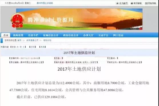 2017年腾冲市土地供应总量只有112公顷,即:1680亩,其中住宅用地只有8公顷,也就是120亩地,可以说整个2017年腾冲市土地供应几乎为0。
