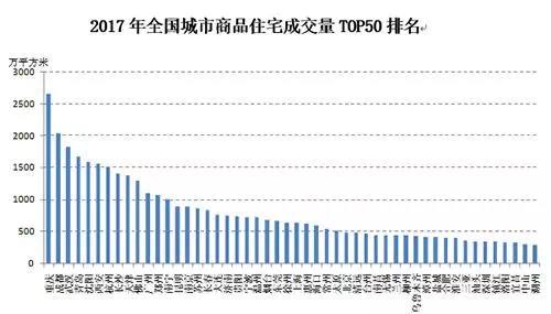 日前发布的《2017年楼市50强城市排行榜》显示,全国新建商品住宅成交量前三名的城市分别是重庆、成都和武汉,成交量分别为2647万平方米、2035万平方米和1826万平方米。