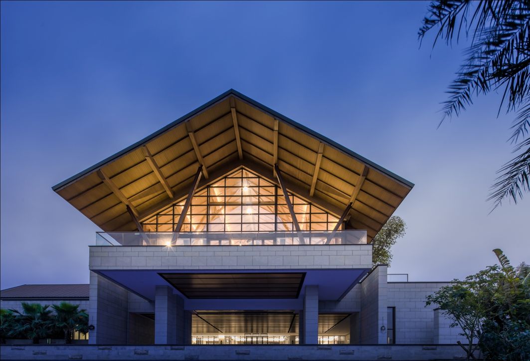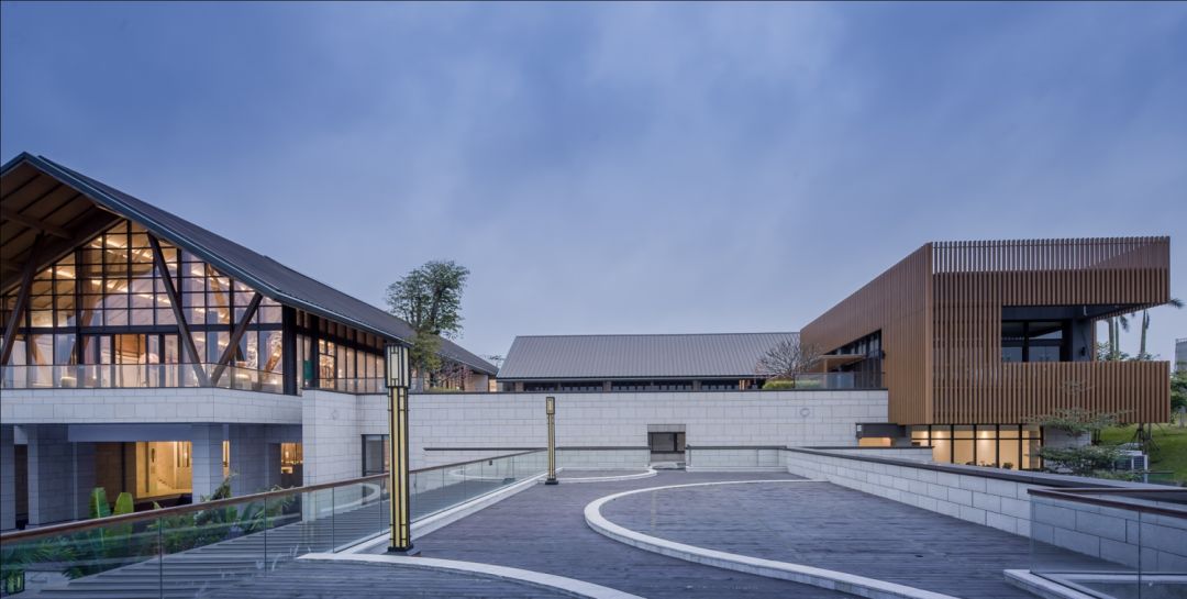 在外立面材料上,屋顶的陶红色钛锌板屋面直接脱胎于本地民居上坡屋顶陶瓦的形象,而玻璃幕墙与石材幕墙则在尊重本土文化的审美原则下,融合了现代简约的设计手法,从建筑的整体感出发,形成素雅大方但又不失亲近感的立面形象,成功将本土文化要素与现代建筑有机结合,达到建筑立面总体的和谐统一。