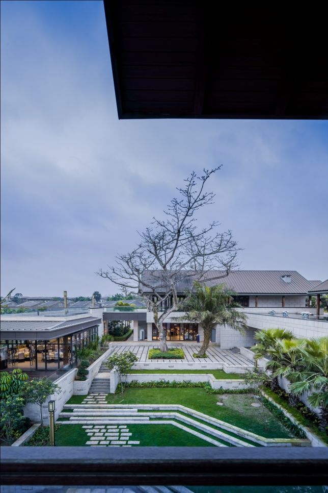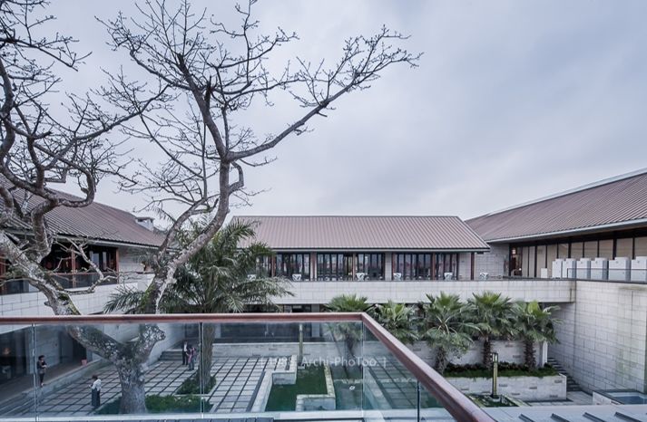 庭院以水池为中心,环绕以建筑外廊和公共休闲空间,将建筑的内部空间向外延伸,在这个过程中室内外空间相互因借,外部空间与内部空间突破各自的界限达成了统一。这种统一也暗合了当地传统建筑的空间特点和布局传统。不同的功能空间通过连廊与步道紧密连接,体块的布置顺应地势、疏密得当。