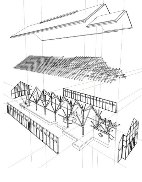 在结构形式上,支撑屋盖系统的“树状”空间杆件结构并不是绘画般象形模仿的结果,它来自于材料和结构组织的客观呈现,是建筑自身关系推敲的结果。