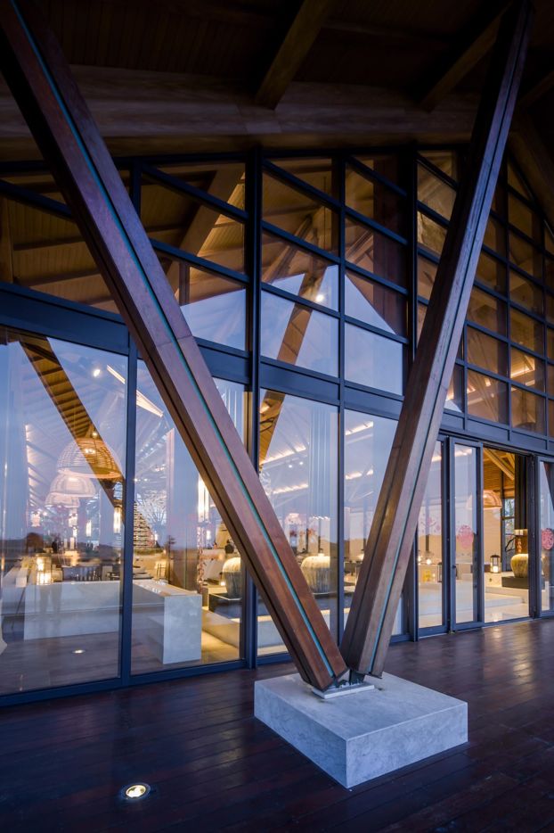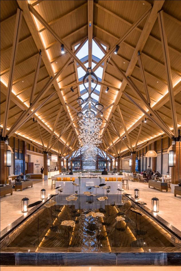 酒店服务中心的屋顶沿屋脊线布置了带状天窗,有采纳自然光线与通风的作用。随着一天中时间的不断变化,光线透过天窗洒在树状结构单元上,形成一种光影扶疏、枝条交错的自然亲切感,空间效果充分摹写了人们漫步林间的氛围。