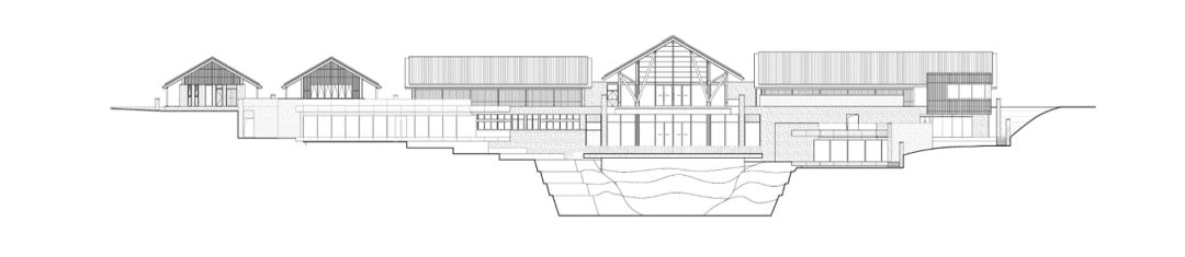 室内空间采用开放式布局,既充分利用自然光线,又将屋盖系统的支撑结构单元直接露明于室内,成对排列、延伸,既暗示了连绵不断的坡屋顶形态,又形成了从入口大堂到多功能大厅,再到观景平台的特定节奏与空间的韵律感,在透视景深的作用下,引导呈现出绵长深远的内部空间。在大堂两侧通过檐廊可以分别到达会议厅、书屋和餐厅,在不同的台地间通过下沉庭院与旋转梯相互连接,各个空间之间的流转过渡自然而顺畅。
