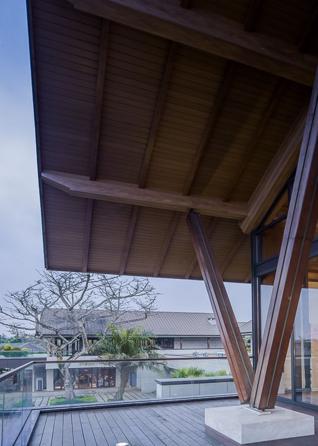 在庭院水景的处理上,以无边水池作为主题,清澈如镜的水池延伸向谷壑与溪流,把建筑所处台地的边缘围护起来,以无形的边界代替有形的扶手栏杆,远处的天空和风景映射在水面上拉近了自然与人的距离。整个展示区的布局与当地热带季风气候,多风多雨的自然环境相呼应,达到了建筑师将建筑空间与当地自然景观、气候相融合的设计目的。