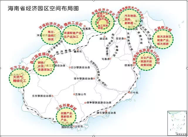 4、西部功能区:主要定位为发展现代工业,由儋州、昌江、东方组成。重点发展儋州,东方市,昌江三个工业区。其中儋州发展石油化工、能源、造纸业等;东方发展天然气化工产业;昌江发展煤矿、铁矿、橡胶制品等。