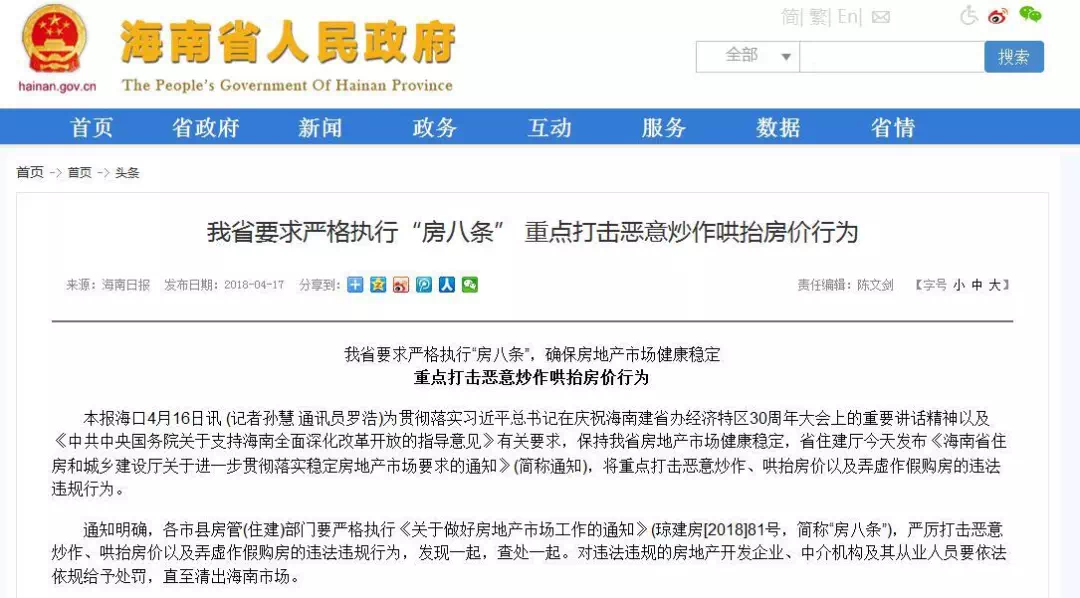 消息二:海南省住建厅发文:严格执行“房八条”防止炒作和哄抬房价。海南省住建厅4月16日发布《海南省住房和城乡建设厅关于进一步贯彻落实稳定房地产市场要求的通知》。明确要求,各市县房管(住建)部门要严格执行《关于做好房地产市场工作的通知》(琼建房[2018]81号,简称“房八条”),严厉打击恶意炒作、哄抬房价以及弄虚作假购房的违法违规行为,发现一起,查处一起。对违法违规的房地产开发企业、中介机构及其从业人员要依法依规给予处罚,直至清出海南市场。