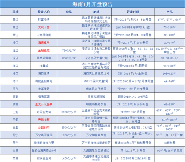 海南1月份19个开盘项目曝光 六个纯新盘抢先看